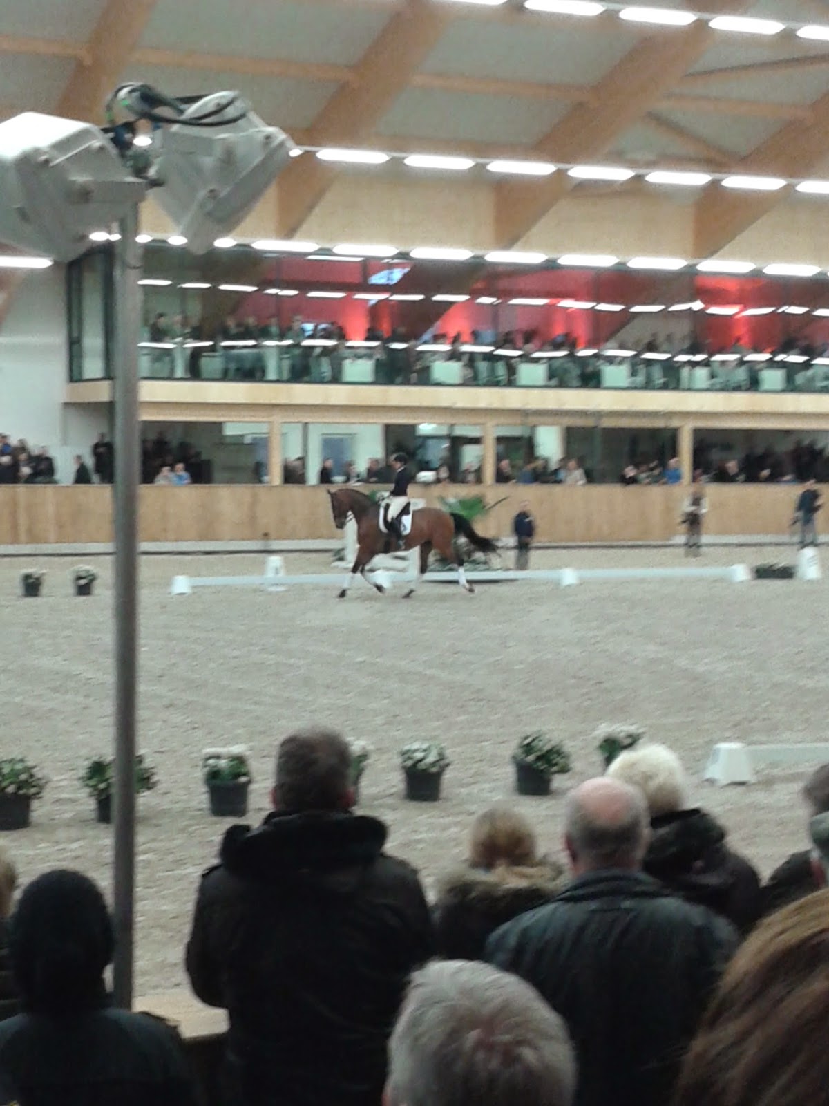 Oh, ich muss euch ein Missgeschick gestehen! Leider habe ich es versäumt, den wirklich schicken und ausgesprochen gangstarken KWPN- Hengst "Goldberg" zu knipsen, der zwar ein wenig in dieser Riesenhalle mit den Maßen 30 x 80 m herumirrte, aber auch tolle Momente mit seinen vier Jahren im Viereck präsentieren konnte. Weil er gar so hübsch war, dass ich kaum die Augen von ihm lassen konnte und sich außerdem zwischenzeitlich mir eine Dame auf die Füße setzte, weil sie nicht so lange stehen mochte, bekam ich den Schwarzen nicht so vor die übersichtliche Handycam-Linse, wie ich ihn haben wollte. Ersatzweise hier sein Pressefoto: